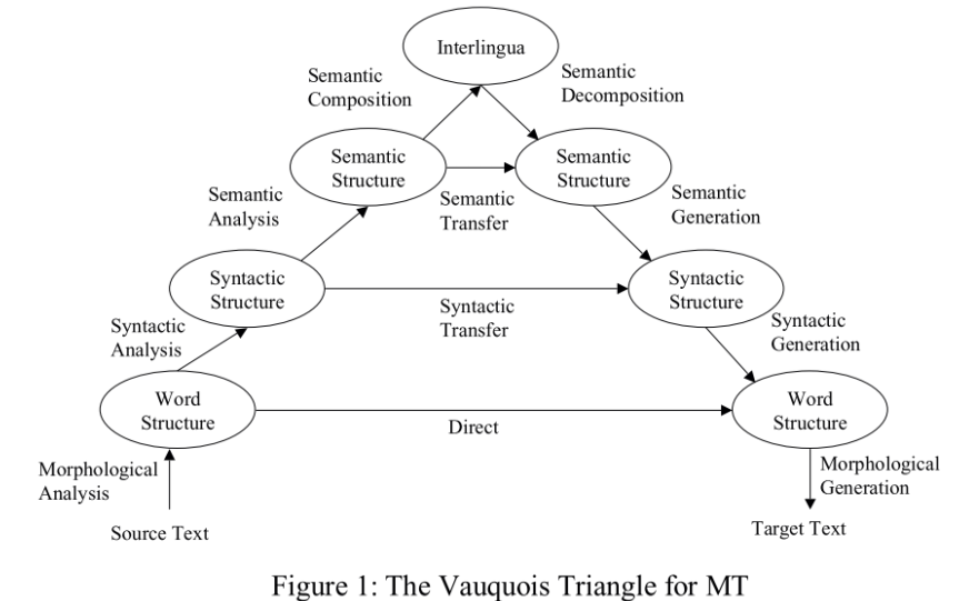- 서론에서 연구자들은 기계 번역 방법론을 직접, 전이, 인공통합의 3가지로 구분한다. 분석의 깊이에 따라, 단어 층위에서 접근하면 직접, 구문론/의미론적 층위에서 접근하면 전이, 그리고 그 전이를 하나의 단일한 기저 표현, 인공통합어로 가져가는 방식이 인공통합이다. 이 Interlingua는 출발어와 도착어를 동시에 표상한다.
