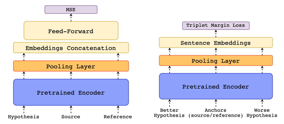 - Estimator model : 결과적으로 '사람이 평가한 점수'를 예측하는 회귀 모델. source, hypothesis, reference로부터 각각 encoding된 embedding을 출력하고, 이 embedding이 pooling layer를 지나면서 각각의 segment에 대한 문장 임베딩이 생성됨. 이를 하나의 벡터로 concat하여 feed-forward regressor로 내보내고, 이 값과 정답 간의 MSE를 목적 함수로 학습함.